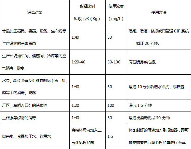 將一袋本品(100g)直接溶于4升水中(塑料容器或噴霧器)靜置3-5分鐘,即得到二氧化氯濃度為2000mg/L的消毒液,加水稀釋后使用。
